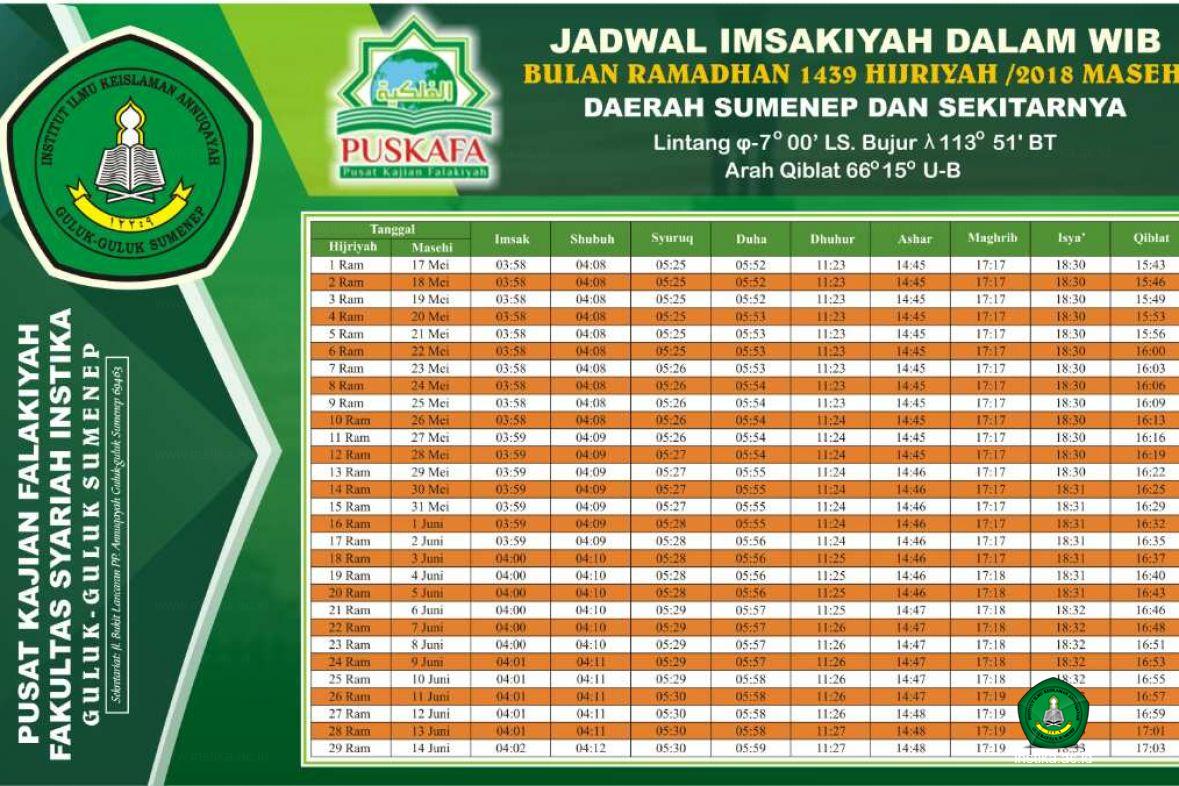 Sumenep - INSTIKA - Pusat Kajian Falakiyah (Puskafa) Fakultas Syariah Institut Ilmu Keislaman Annuqayah (INSTIKA) Guluk-Guluk Sumenep membagi-bagikan Jadwal Imsakiah dalam Waktu Indonesia Barat (WIB) khusus bulan Ramadan 1439 Hijriyah/2018 Masehi kepada warga Sumenep dan sekitarnya.