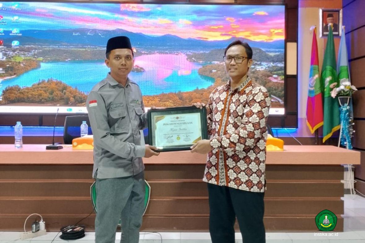 Fajar Imanuddin dari pihak Phintraco Sekuritas yang memberikan penghargaan itu. Sementara yang menerimanya adalah Moh. Afifi Habib ketua KSPM GIBEI INSTIKA.